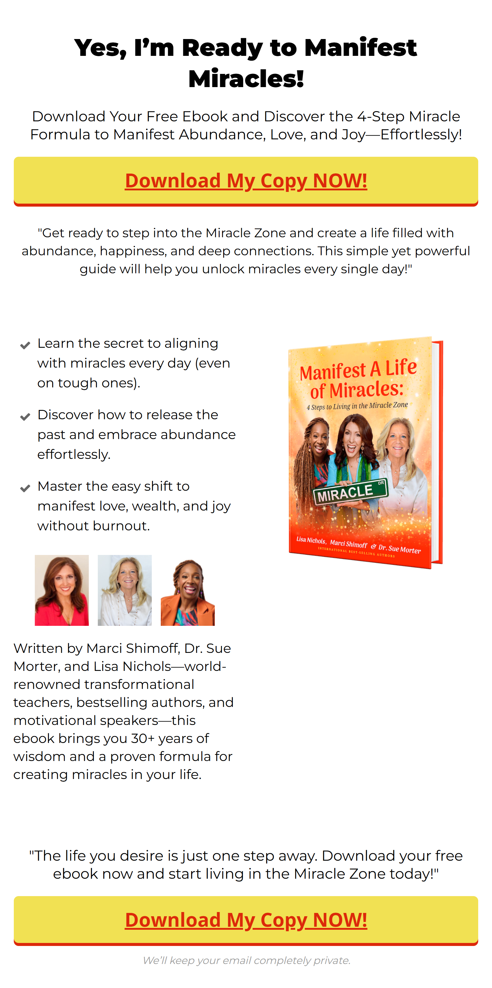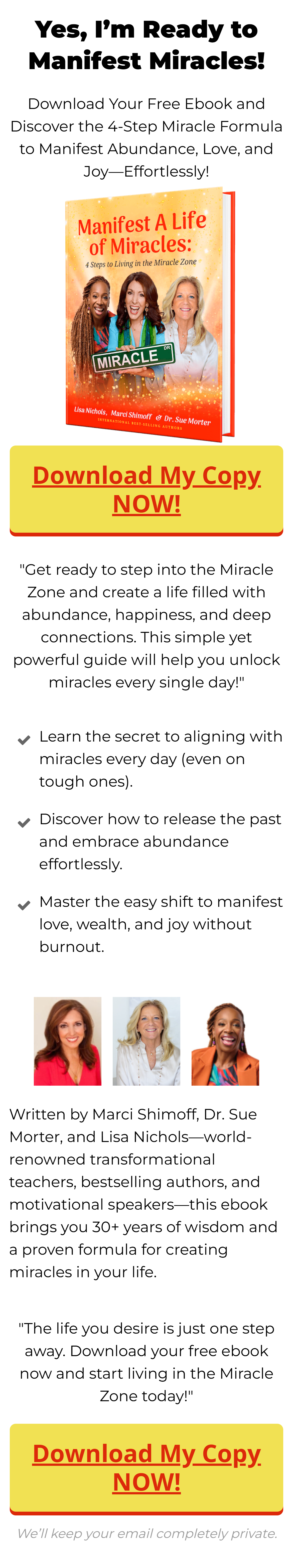 Baixe o e-book de Marci Shimoff e explore a fórmula de 4 passos para milagres diários.